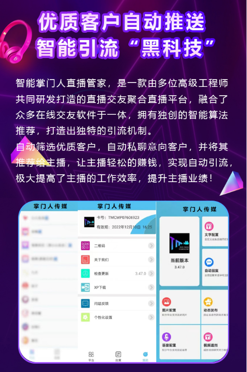 而且,掌门人新直播·秀生活项目通过智能算法推荐,能够自动识别并筛选出那些潜在的优质客户,这些客户可能是对主播感兴趣的用户,或者是潜在消费者。通过自动私聊功能,直播管家能够与这些意向客户进行一对一的互动,进而精准地将他们推荐给主播,这不仅能够增加主播的曝光度和知名度,还能够提升主播的收入和业绩。通过平台的推流功能,主播可以直接将自己的直播内容推送给平台上的用户,从而拥有稳定的观众群体,为自己带来更多的曝光和粉丝。