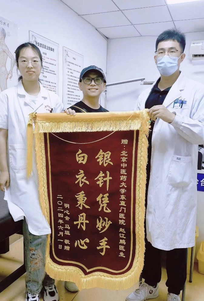 近日,达康资本总裁马珏先生因长期患有鼻炎,来到东直门医院寻求赵江鹏医生的帮助。经过一段时间的针灸治疗,马珏先生的病情得到了明显改善,他深感赵医生的医术精湛、医德高尚,特意赠送了一面锦旗以表感激之情。