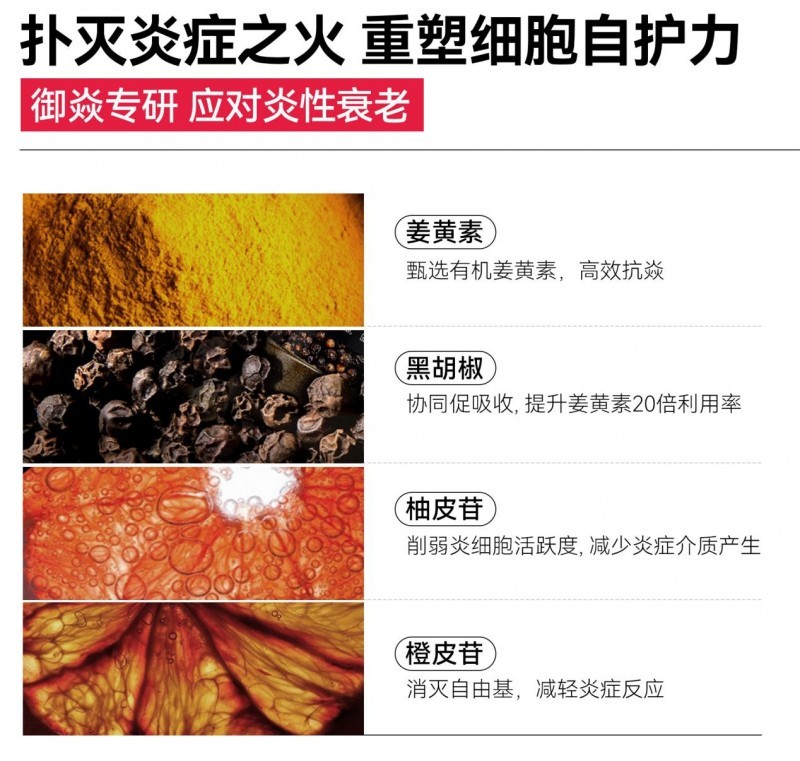首先,LAIFE「乐返盾」精选了符合欧盟标准、0农残的有机姜黄素,这一被誉为植物界“阿莫西林”的成分,在与黄金搭档黑胡椒复配后,其生物利用率提升了20倍,为人体带来了显著的抗炎效果。这一配方不仅能够有效减轻炎症反应,还有助于改善因高糖引起的各种健康问题,如胰岛素抵抗和糖尿病等。