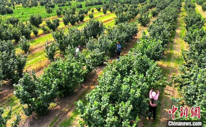 7月12日,走进河北省衡水市阜城县建桥乡一榛子种植基地,榛子陆续成熟,迎来丰收季。这些采摘的鲜食榛子将被运往辽宁省的加工基地,通过电商平台销往中国各地,并出口到韩国、俄罗斯等国家和地区。目前,阜城县鲜食榛子种植面积达4000亩,其中800亩榛子林达到盛果期,预计年产鲜果70万斤,年产值超400万元。图为河北省衡水市阜城县建桥乡一榛子种植基地。(无人机照片)薛腾飞 摄