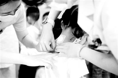 在医生的专业操作下,10岁的彤彤(化名)很快完成了贴敷。“这是我们第一次带孩子来贴三伏贴,之前听一个朋友推荐的,他每年都贴,效果还不错。我家孩子鼻窦炎特别严重,一到冬天就犯病,在朋友的建议下,今儿一大早就带着孩子过来了。”彤彤妈妈说。