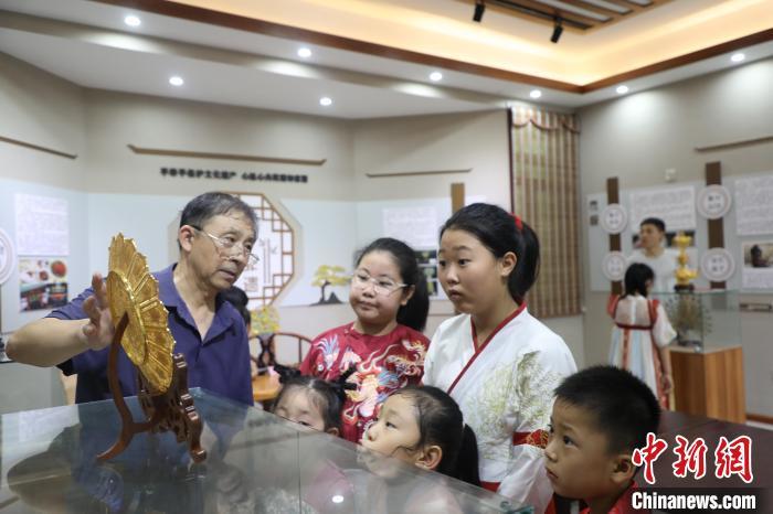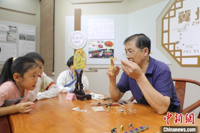 7月25日,河北省衡水市冀州区文化馆内,学生们身着汉服,在“非遗课堂”沉浸式体验传承千年的宫廷技艺冀州花丝。“花丝”就是用金银丝等金属细丝经编织、堆垒、平填、镶嵌而成的传统金属工艺品,历史上一直是皇家御用之物。当日,衡水市冀州区康氏花丝技艺传承人康运青生动讲解了花丝技艺的历史文化、用途及制作工序,学生们近距离感受到非物质文化遗产的魅力。截至目前,冀州区组织开展三皇炮捶、冀州花丝、剪纸等非遗项目暑期公益培训、研学活动100余场,参与中小学生2000余人次。图为河北省衡水市冀州区文化馆内,康运青给学生们讲解花丝作品的制作过程。刘延岭 摄