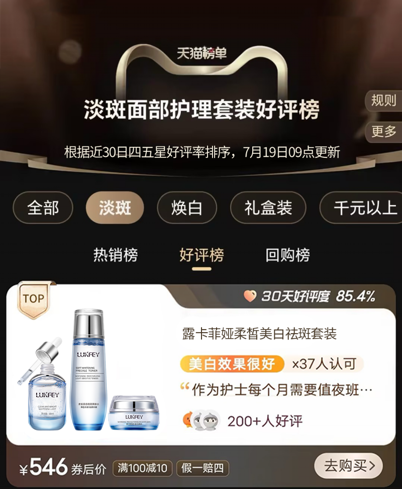 露卡菲娅祛斑套装攻关核心祛斑技术十余载,只为每一个斑点星人找到安全高效的解决方案。每一套产品都严格在具有GMP资质的工厂生产,按照国际生产标准制作,出厂前必先通过严格、近乎苛刻的医学测试。作为一个实力雄厚、集产品、研发全能一体的品牌,露卡菲娅祛斑套装以其实力获得诸多荣誉。近几年,露卡菲娅祛斑套装逐渐斩获中国祛斑“年度新锐品牌”、天猫护肤榜“年度TOP1”等称号,以势不可挡之姿成为祛斑美白界的新焦点。