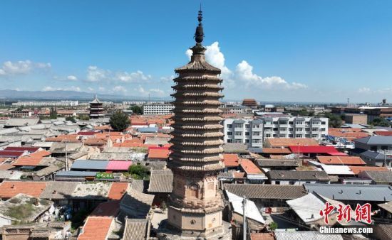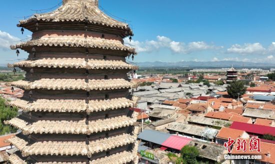 8月22日,航拍河北省张家口市蔚县南安寺塔。近日,中国首款3A游戏《黑神话:悟空》正式上线。该游戏以中国古代名著《西游记》为背景,挖掘并融入了丰富的中华传统文化元素。在游戏中,玩家可以身临其境地体验到众多文物古建的独特魅力,蔚县南安寺塔就是游戏取景地之一。(无人机照片) 中新社记者 韩冰 摄