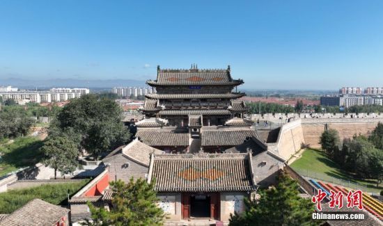 8月22日,航拍河北省张家口市蔚县玉皇阁。近日,中国首款3A游戏《黑神话:悟空》正式上线。该游戏以中国古代名著《西游记》为背景,挖掘并融入了丰富的中华传统文化元素。在游戏中,玩家可以身临其境地体验到众多文物古建的独特魅力,蔚县玉皇阁就是游戏取景地之一。(无人机照片) 中新社记者 韩冰 摄