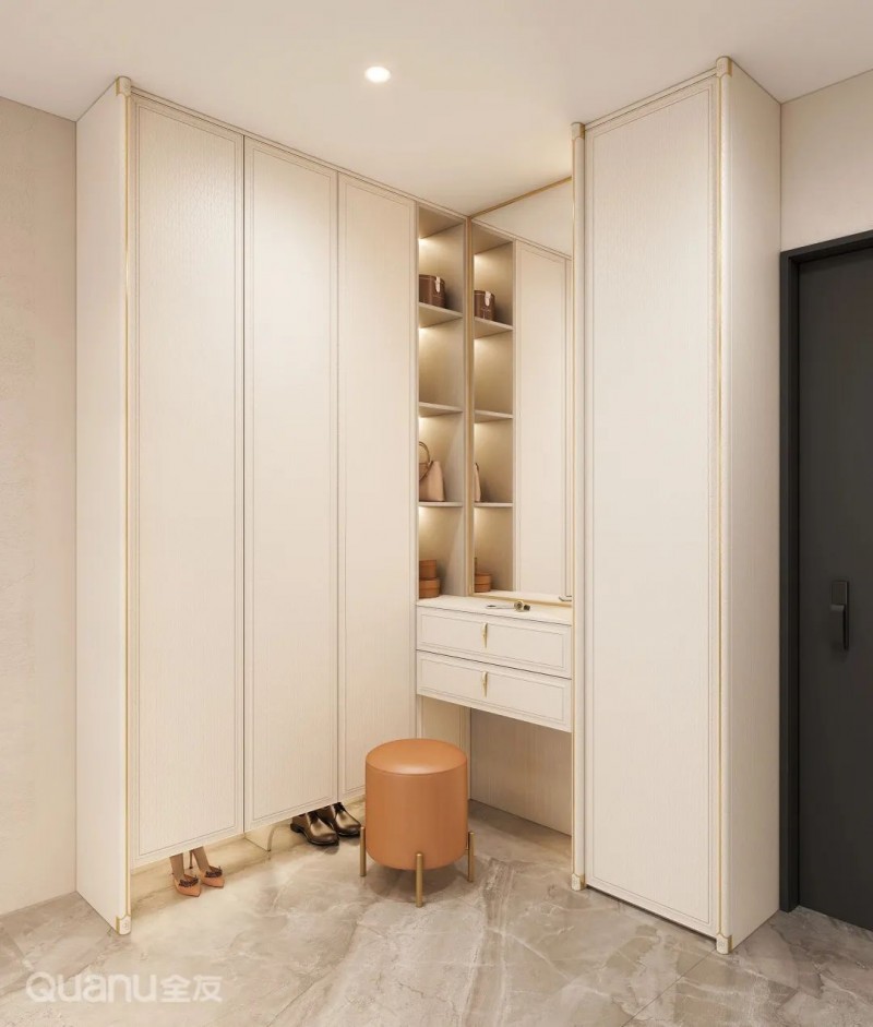 ①换鞋凳在距离地面高度40-45cm的位置设置换鞋凳,与鞋柜相结合做一体式设计,既能实现从容换鞋,凳子底部的空间也能用来收纳鞋类或小件物品。