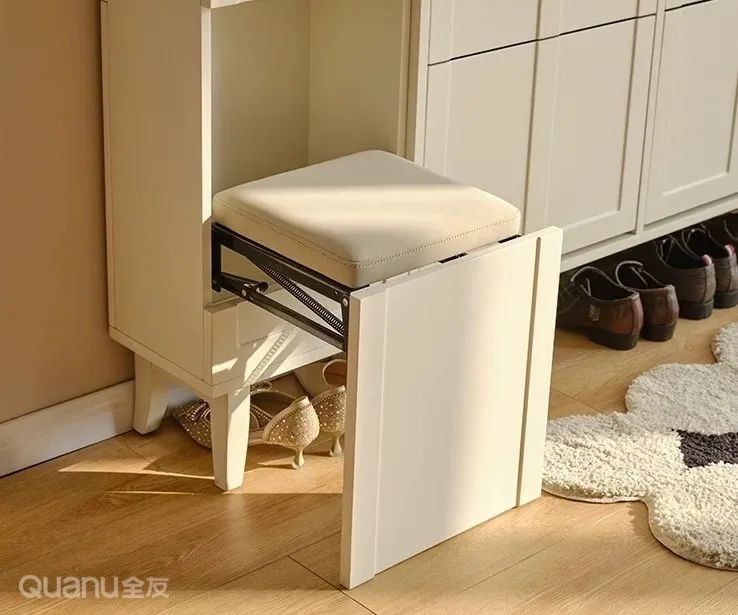 若是空间过于狭窄,可做成折叠凳设计,精致小巧,不用时收进柜内,不占过道空间。