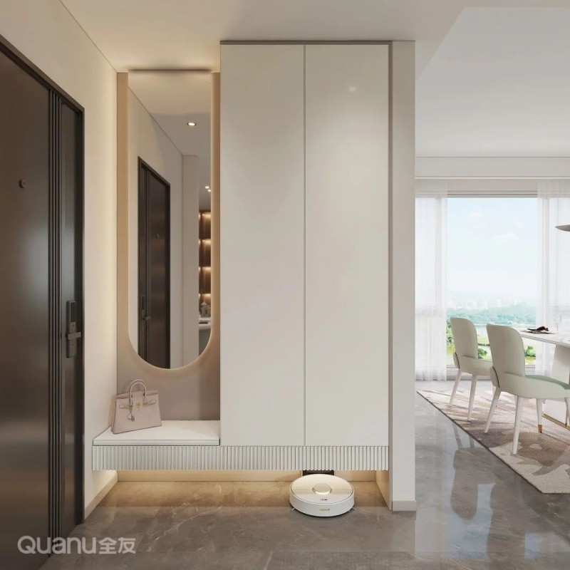 更换常用鞋不想频繁开柜门,可在柜体底部预留20cm左右的空间,将替换下的鞋子放入悬空区,不用弯腰收纳也可保证玄关干净整洁,扫地机器人进出无忧,清洁更方便。