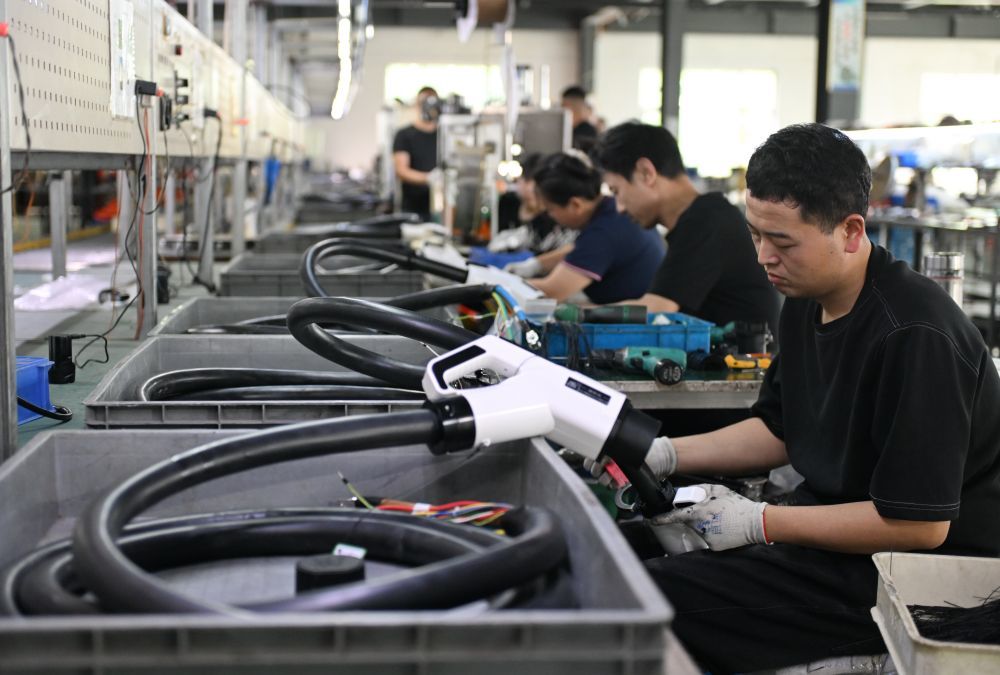 ↑9月13日,工人在位于任丘市的瑞安达光电科技有限公司组装电动汽车充电枪。