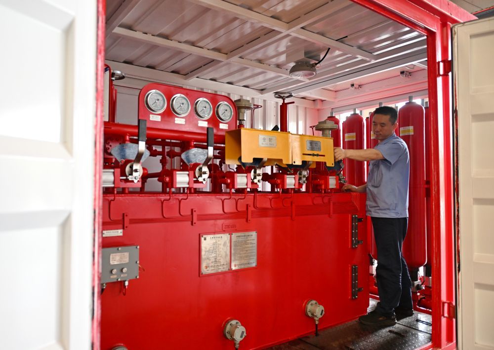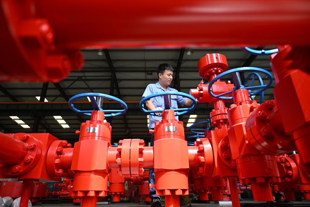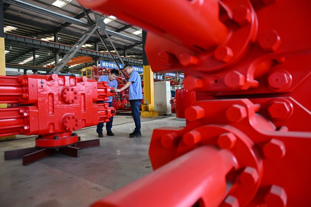↑9月13日,工人在位于任丘市的河北新铁虎石油机械有限公司车间内调试产品。