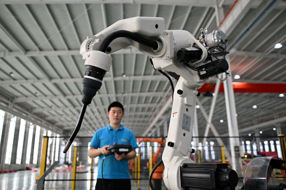 ↑9月13日,工人在位于任丘市的金狮智能机器人有限公司生产车间内调试产品。