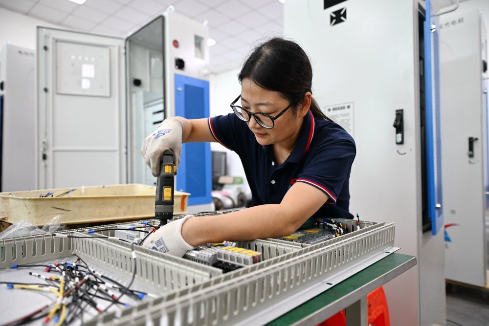 ↑9月13日,工人在位于任丘市的瑞安达光电科技有限公司组装电动汽车直流智能充电桩。