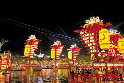 9月12日晚,众多游客在唐山丰南河头老街观彩灯、看表演。本报记者 王育民摄