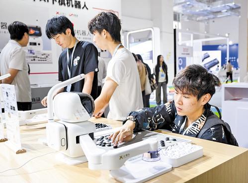 9月20日,观众在体验与AI下棋机器人对弈。 本报记者 耿辉摄