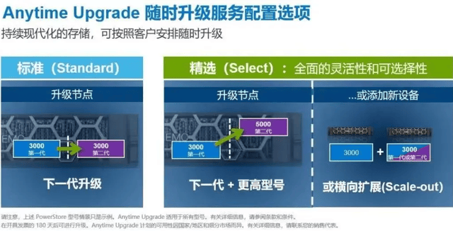 拥有随时升级计划(Anytime Upgrade)的戴尔PowerStore用户可在签署“随时升级”方案180天之后至合约期满前,根据其自身需求,能随时针对存储设备进行升级,极具灵活性。例如将系统节点(控制器)升级到下一代同等型号或下一代+更高型号。