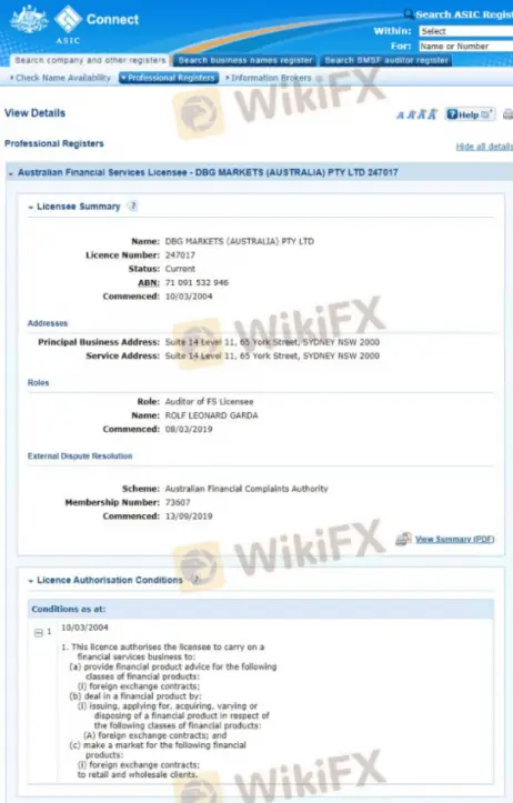 澳大利亚(ASIC - 澳大利亚证券和投资委员会):DBG Markets (Australia) PTY LTD 由澳大利亚证券和投资委员会 (ASIC) 授权和监管,执照号为 247017