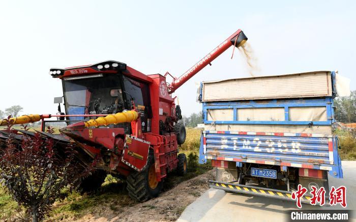 10月15日,河北省衡水市阜城县建桥乡一谷子种植基地,多台收割机在谷田里来回穿梭,收割、脱粒、秸秆粉碎一气呵成。连日来,当地逾万亩谷子陆续成熟,迎来丰收季。阜城县不断优化农业产业结构,立足节水压采实际,推广种植优质耐旱谷子,截至目前,该县谷子种植面积逾一万亩,年产谷子超1000万斤,谷子已成为当地百姓增收致富的“黄金米”。图为收割机将收获的谷子装车。 崔贤飞 摄