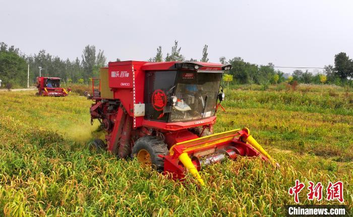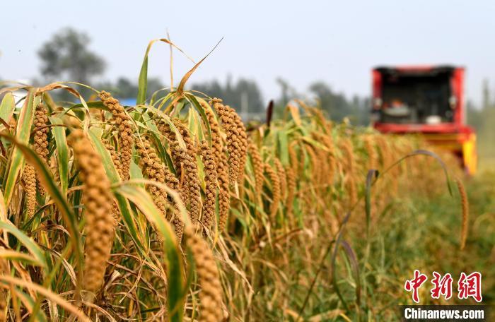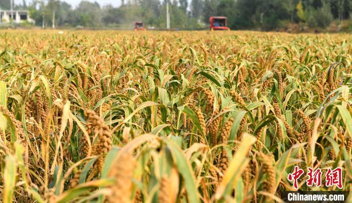 10月15日,河北省衡水市阜城县建桥乡一谷子种植基地,多台收割机在谷田里来回穿梭,收割、脱粒、秸秆粉碎一气呵成。连日来,当地逾万亩谷子陆续成熟,迎来丰收季。阜城县不断优化农业产业结构,立足节水压采实际,推广种植优质耐旱谷子,截至目前,该县谷子种植面积逾一万亩,年产谷子超1000万斤,谷子已成为当地百姓增收致富的“黄金米”。图为收割机在收获谷子。 崔贤飞 摄