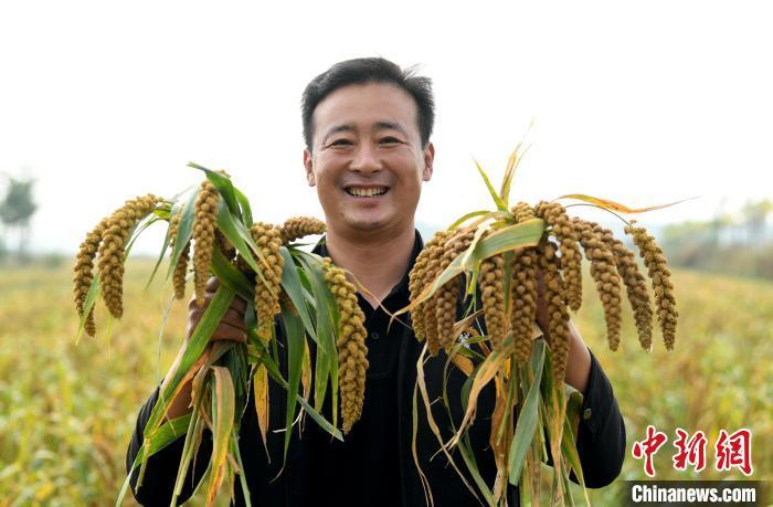 10月15日,河北省衡水市阜城县建桥乡一谷子种植基地,多台收割机在谷田里来回穿梭,收割、脱粒、秸秆粉碎一气呵成。连日来,当地逾万亩谷子陆续成熟,迎来丰收季。阜城县不断优化农业产业结构,立足节水压采实际,推广种植优质耐旱谷子,截至目前,该县谷子种植面积逾一万亩,年产谷子超1000万斤,谷子已成为当地百姓增收致富的“黄金米”。图为村民展示收获的谷子。 崔贤飞 摄