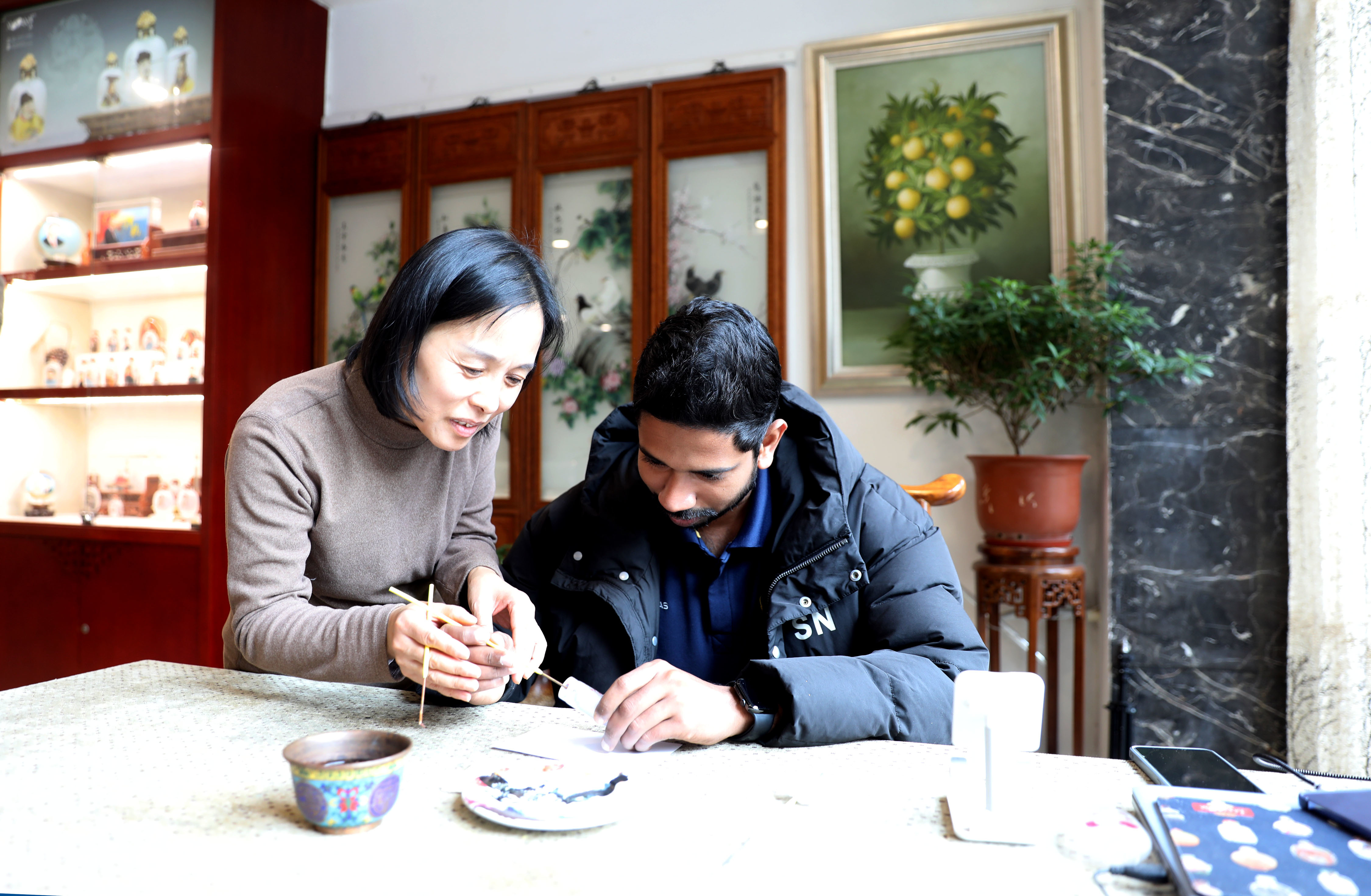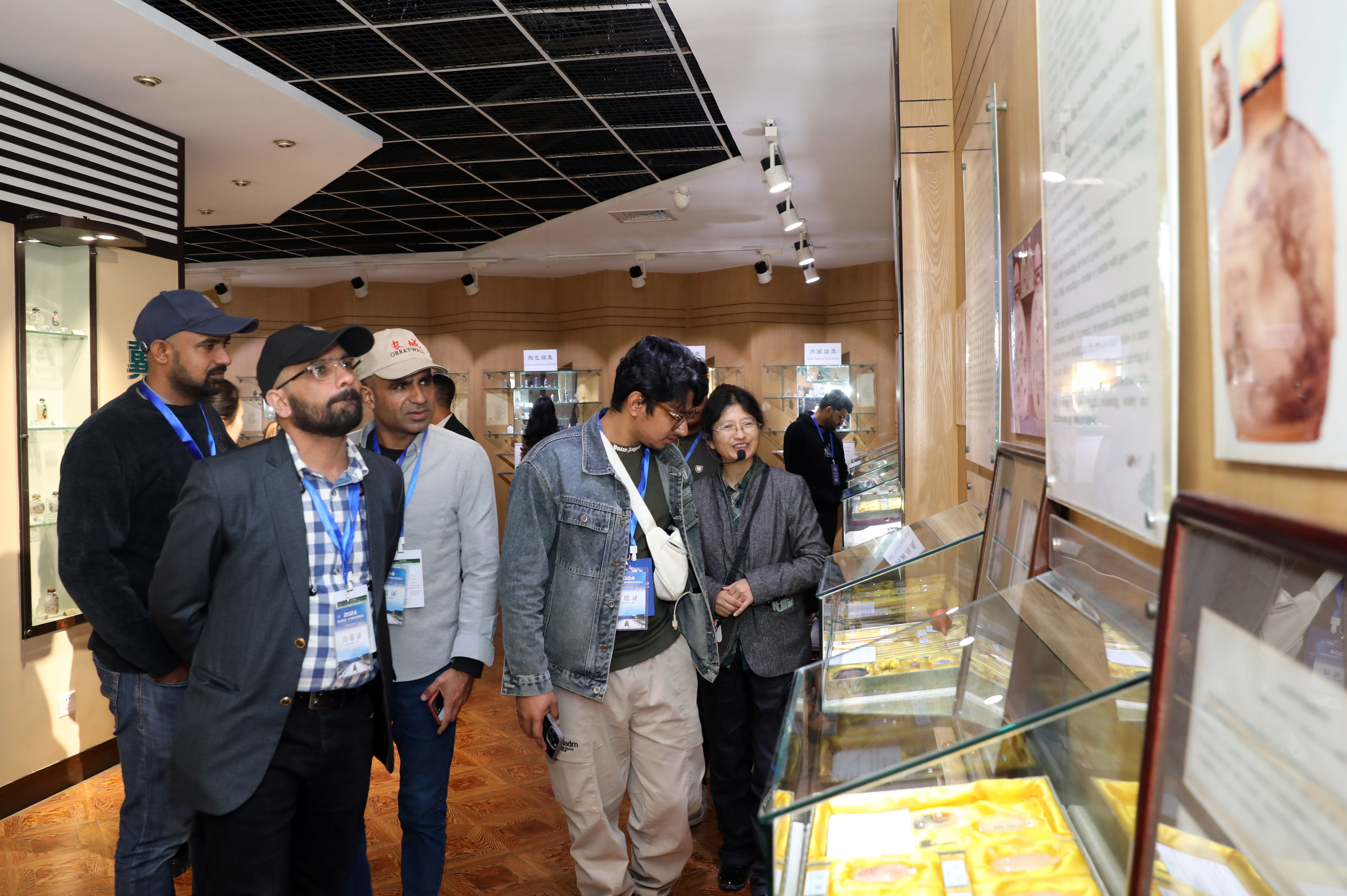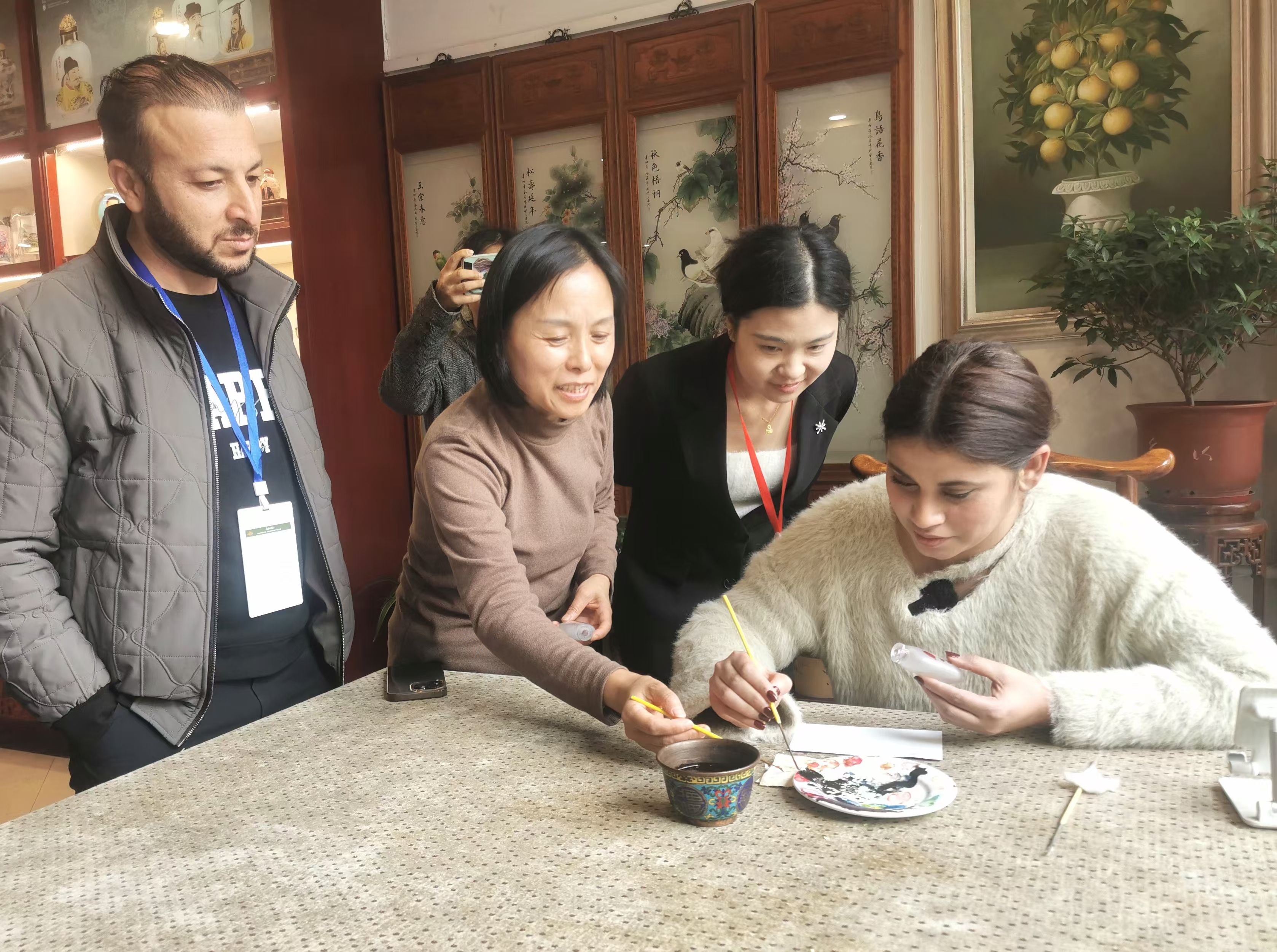 来到衡水内画艺术博物馆的鼻烟壶主展厅,这里仿佛是一个艺术的微观世界。晶莹剔透的水晶球、小巧玲珑的鼻烟壶等内画艺术品瞬间吸引了大家的目光。“太不可思议了,这么小的空间能绘制出如此精美的画面!”来自俄罗斯的阿罗霍惊讶地说道。大家还纷纷亲身体验内画创作的奇妙,他们小心翼翼地拿起画笔,虽然手法略显生疏,但每个人的脸上都洋溢着对这门艺术的热爱和对中华文化的好奇。