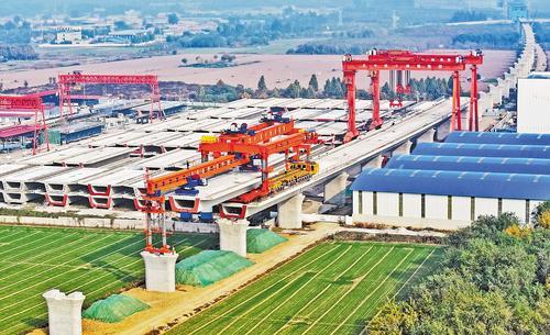 11月3日,在雄忻高铁施工现场,中铁十四局高铁箱梁单双线共用运架机在架设箱梁。本报记者 张 昊摄