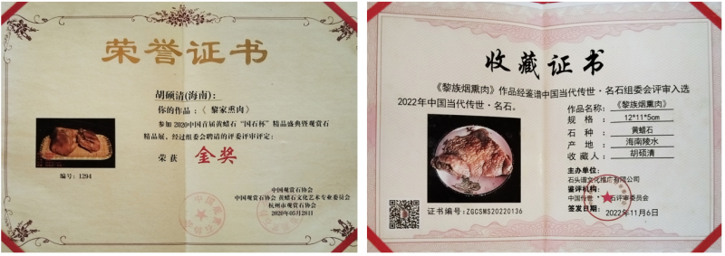 时序轮转,千秋作序。胡硕清的玩石之路已走过了二十余年,在此期间,他时常在闲暇时刻随友人踏入山林,共同探寻浑然天成的肉石瑰宝,带回家中后进行创作。他深谙肉石之美,源自其浑然一体的自然韵味,对此,胡硕清表示:肉石之美,在于其未经雕琢的自然之趣。而他也始终秉持着尊重自然、崇尚天然的原则,贯彻天然灵石的理念,在创作中致力于展现肉石独有的形态、色泽与纹理之美,坚守皮、膘、肉、骨、毛等要素,使其生动逼真、惟妙惟肖。其创作的《黎家卤肉》荣获了“2023年首届江西吉安石尚红魂奖暨第二届井冈杯特等奖”;《黎家红烧肉》《东坡扣肉》等作品也获得了诸多奖项。