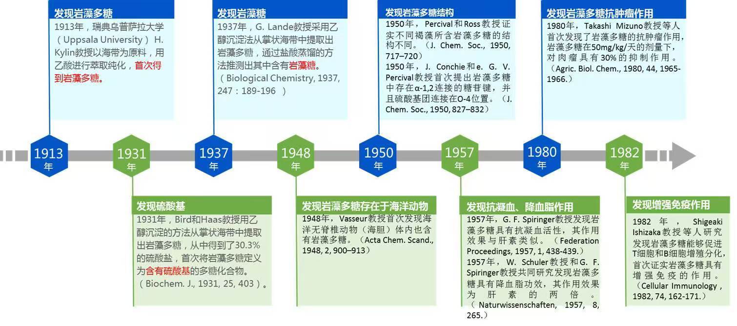 1913年瑞典乌普萨拉大学(Uppsala University) H. Kylin教授首次发现岩藻多糖,起初命名为Fucoidin。 H. Kylin教授以海带及墨角藻为原料,用乙酸进行萃取纯化得到岩藻多糖(Physiol. Chem. 1913, 83, 171–197)。