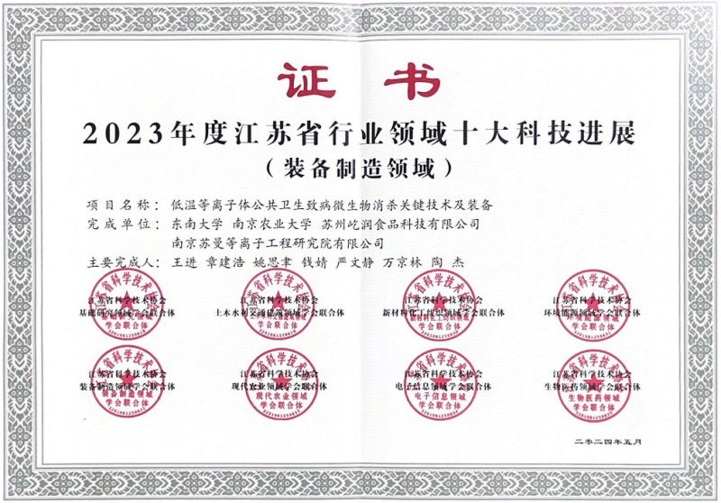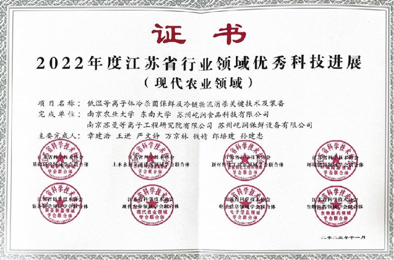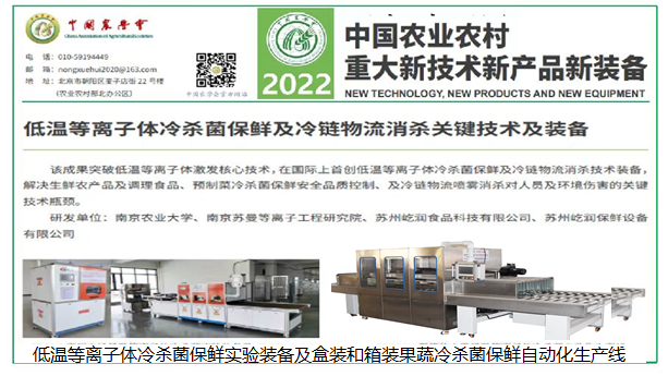 截至目前,低温等离子体冷杀菌技术的前沿装备已累积申请发明专利高达32项,其中成功获得授权的发明专利包括5项国内核心专利、5项实用新型专利,以及在国际舞台上占据重要席位的8项PCT(专利合作条约)发明专利。其中,2019、2023年在美国及2022年在日本相继获得的发明专利授权,不仅彰显了“高压电场CPCS核心技术原理与自动化生产线”领域的国际引领地位,还进一步巩固了我国在全球科技创新版图中的优势。2021年11月28日,在中国畜产品加工研究会组织的科技成果第三方评价中,以中国工程院院士谢明勇为领军的权威专家组,对“低温等离子体冷杀菌保鲜与冷链物流消杀关键技术及装备”项目给予了高度评价,认为该项目技术总体达到国际先进水平,其核心高压电场低温等离子体冷杀菌技术装备更是跨越至国际领先水平,展现出巨大的应用潜力与开发前景。2022年12月,农业农村部携手中国农学会,将“低温等离子体冷杀菌保鲜及冷链物流消杀关键技术及装备”这成果正式纳入《2022中国农业农村重大新技术新产品新装备》名录,并广泛推广其应用,标志着该技术正式迈入国家农业科技创新与应用的前沿阵地。