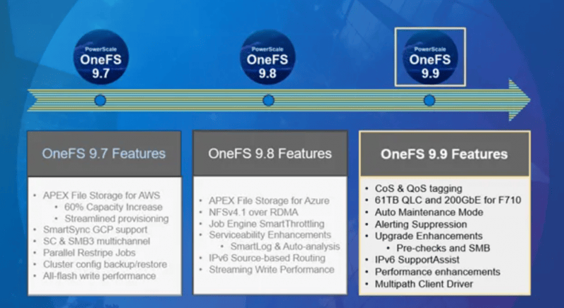 一年内发布三个OneFS版本。OneFS操作系统是PowerScale的核心和灵魂,今年至今,OneFS接连推出3个重要版本,先是2月的9.7版,4月的9.8版,再来是8月的9.9版。这三个版本分别在云、网络、安全和底层架构等方面为PowerScale平台带来一系列重要新功能。