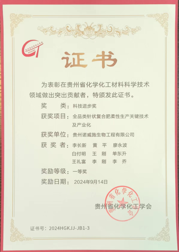 近日,由贵州省化学化工学会组织的2024年度“化工科学技术奖”评选结束,经资料审查和奖励评审委员会总评,贵州诺威施生物工程有限公司《全品类针状复合肥柔性生产关键技术及产业化》获得“化工科技进步奖项”一等奖。该奖项是奖励在化工领域科技成果开发、转化、推广的工业化应用过程中,完成重大工程、技术改造、建设项目等方面做出 突出贡献的项目团队。