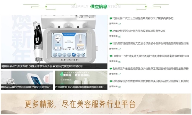 这次打造的美容服务行业平台,在资源整合、信息透明、个性化服务、市场拓展、政策支持与市场需求等方面具有显著优势,并在推动行业标准化与专业化、促进技术创新与交流、提升消费者健康意识以及创造就业机会与经济贡献方面发挥着重要作用。美容服务行业平台涵盖中医美容、穴位按摩、美容机构、美容器材、美容产品、皮肤护理、面部整形和身体塑形等平台分类,拥有新闻资讯、供应信息、求购信息、企业名录、招商加盟、行业展会和人才招聘等功能模块,通过平台的资源整合,商家和服务者可以实现资源共享,提高服务效率,降低成本。利用大数据和人工智能技术,美容服务行业平台为行业带来了新的发展机遇,推动了新型美容仪器、高科技护肤产品和智能化健康管理设备等创新产品的研发和推广,这不仅提升了行业的科技含金量,还为消费者提供了更加便捷、高效、个性化的服务体验。平台欢迎任何体量的商家和服务者加入平台,对于小型美容商家而言,美容服务行业平台提供了一个展示自己、拓展市场、建立品牌的渠道,通过平台,商家可以突破地域限制,触达更广泛的消费者群体,提升品牌知名度,促进了品牌与消费者之间的互动和信任建立。