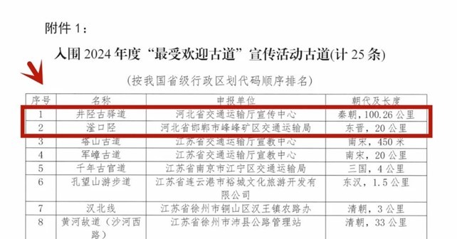河青新闻网讯 12月5日,记者从河北省交通运输厅获悉,我省井陉古驿道与滏口陉入围2024年度“最受欢迎古道”入围名单(见下图)。