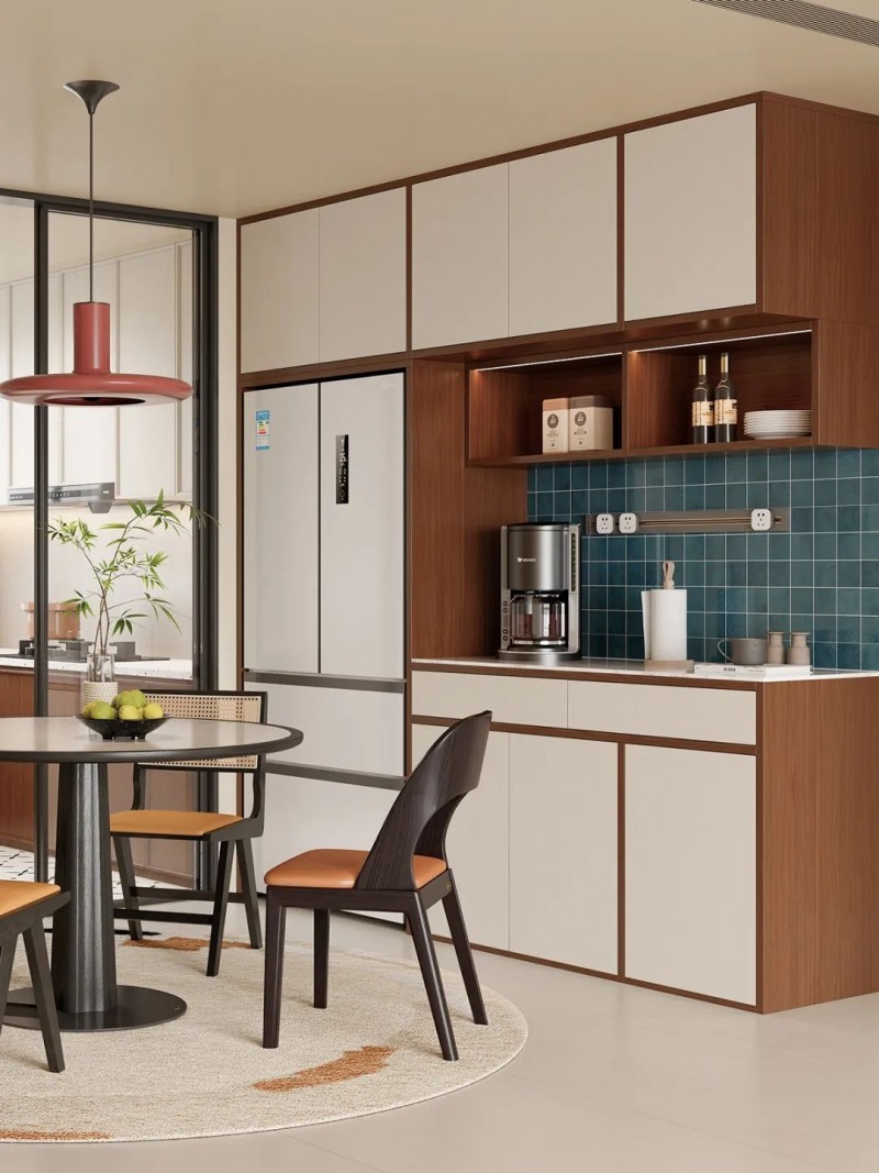 ②背景复古砖与餐边柜形成视觉碰撞,强烈的反差塑造出丰富的层次感,让人在用餐时也能感受到复古魅力。