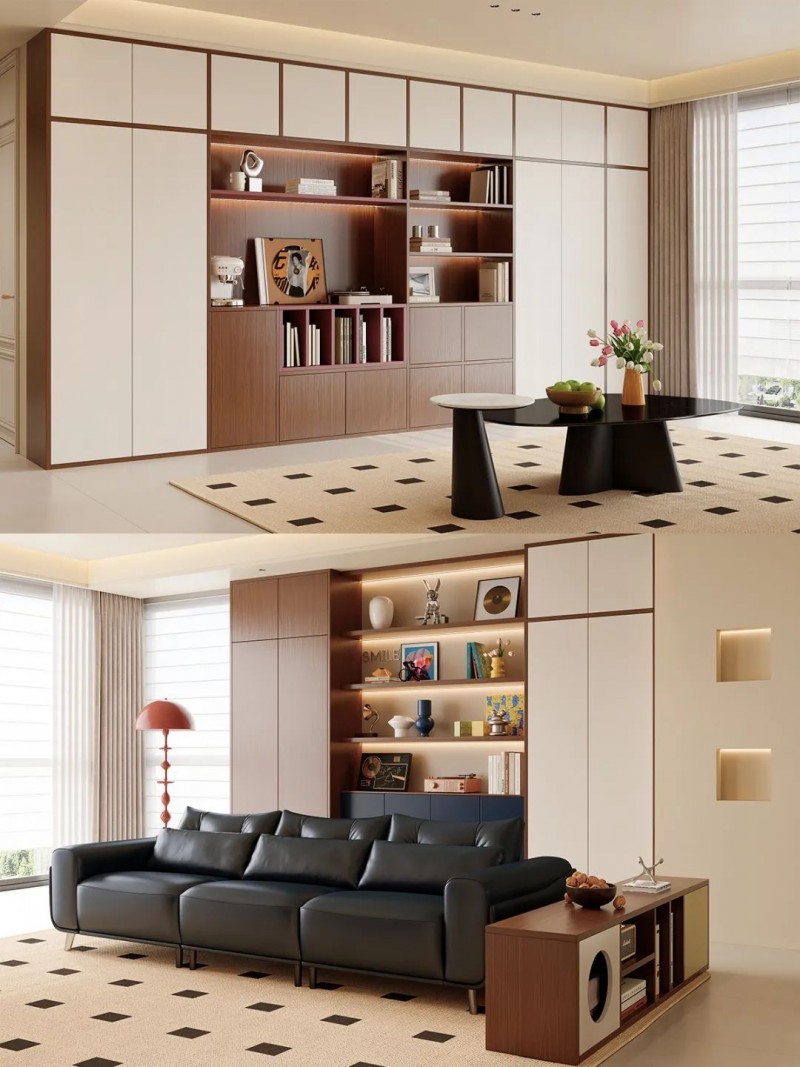 ①去客厅化设计,整墙电视柜提供大容量储物空间,半开放式柜门藏露兼备。中古木料做基底,搭配白色柜门与木色围边,立体层次感跃然眼前,营造出浓郁的复古风情;