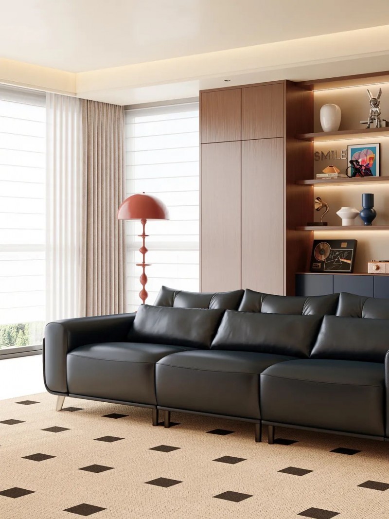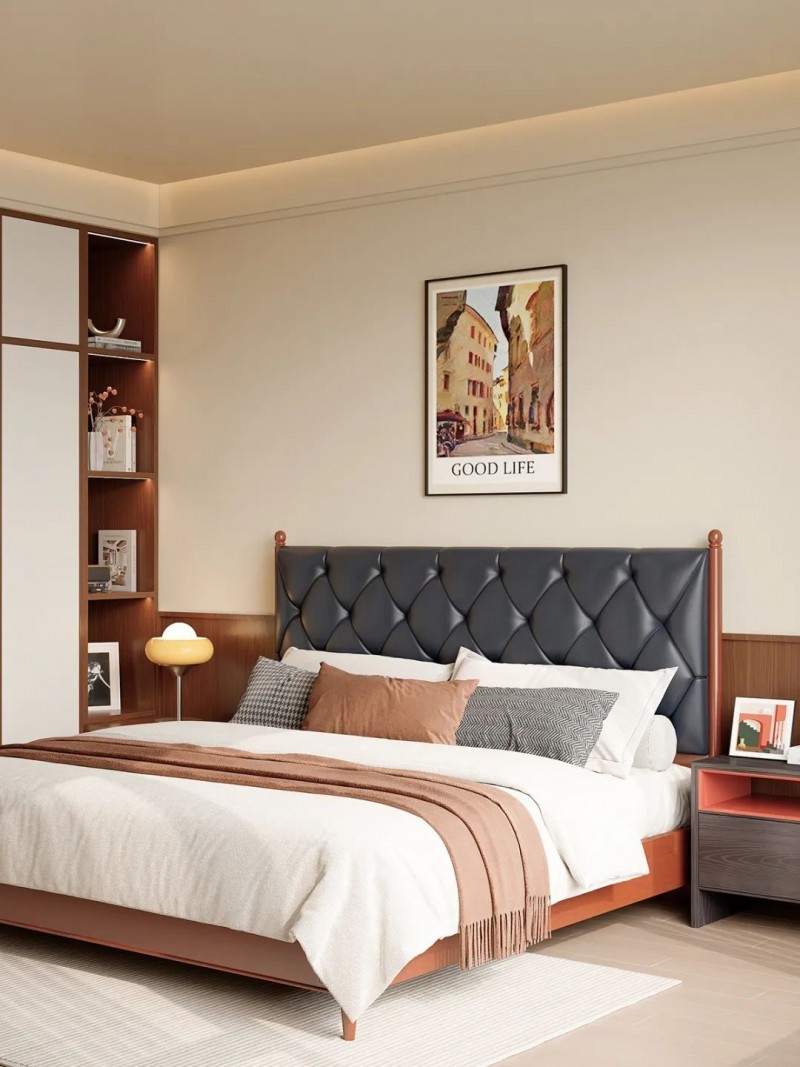 ②复古皮床低调有质感,搭配精致台灯,暖光轻洒,为睡眠空间增添温馨氛围,仿若时光在此温柔沉淀。
