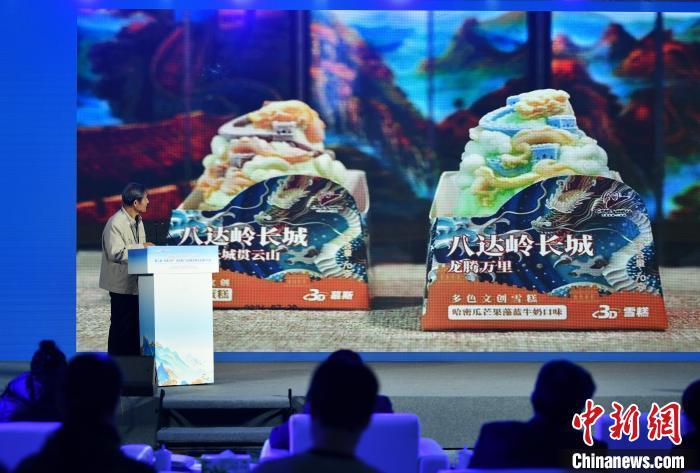图为北京市文物保护协会会长、北京市文物局原局长孔繁峙介绍八达岭长城多色文创雪糕。中新社记者 翟羽佳 摄