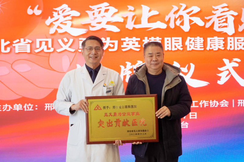 本次启动仪式,为表彰邢台爱尔眼科医院对见义勇为英模的付出和贡献,邢台市见义勇为工作协会会长赵大鹏为邢台爱尔眼科医院授予“见义勇为公益事业突出贡献医院”荣誉标牌,武群英副院长上台接受荣誉。全体到场嘉宾一同见证,“爱要让你看见”邢台市见义勇为英模眼健康服务公益活动正式启动!