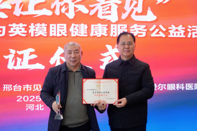 此次公益项目的开展得益于邢台爱尔眼科医院CEO迟殿军的大力支持与协调。在爱尔眼科入驻邢台的6年以来,迟殿军先生在邢台开展十余公益项目,投入超3千余万。此次为见义勇为英模提供眼健康服务,彰显了邢台爱尔眼科大爱和社会责任感。经邢台市见义勇为协会决议,授予迟殿军先生“见义勇为公益事业突出贡献个人奖”。