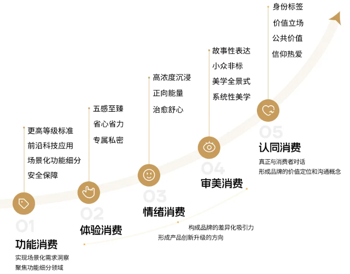 质享人群的“需求升级”,可以从五个层面进行分析——功能、体验、情绪、审美和认同,小红书《质享人群白皮书》中也详细描述了这五个层面的具体表现: