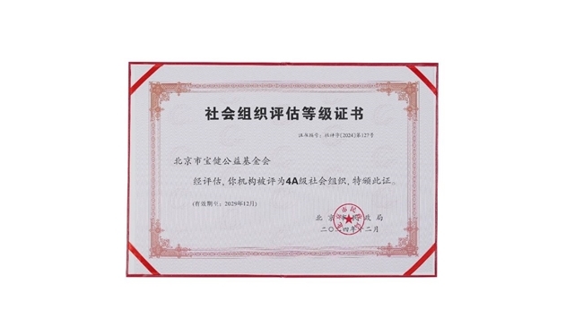 此次评估由北京市民政局委托专业评估机构,对所有参评的市级社会组织按照内部治理、党的建设、发挥作用情况、遵章守规情况、诚信建设这五个一级指标进行评估。最终,宝健公益基金会被评定为4A级社会组织。