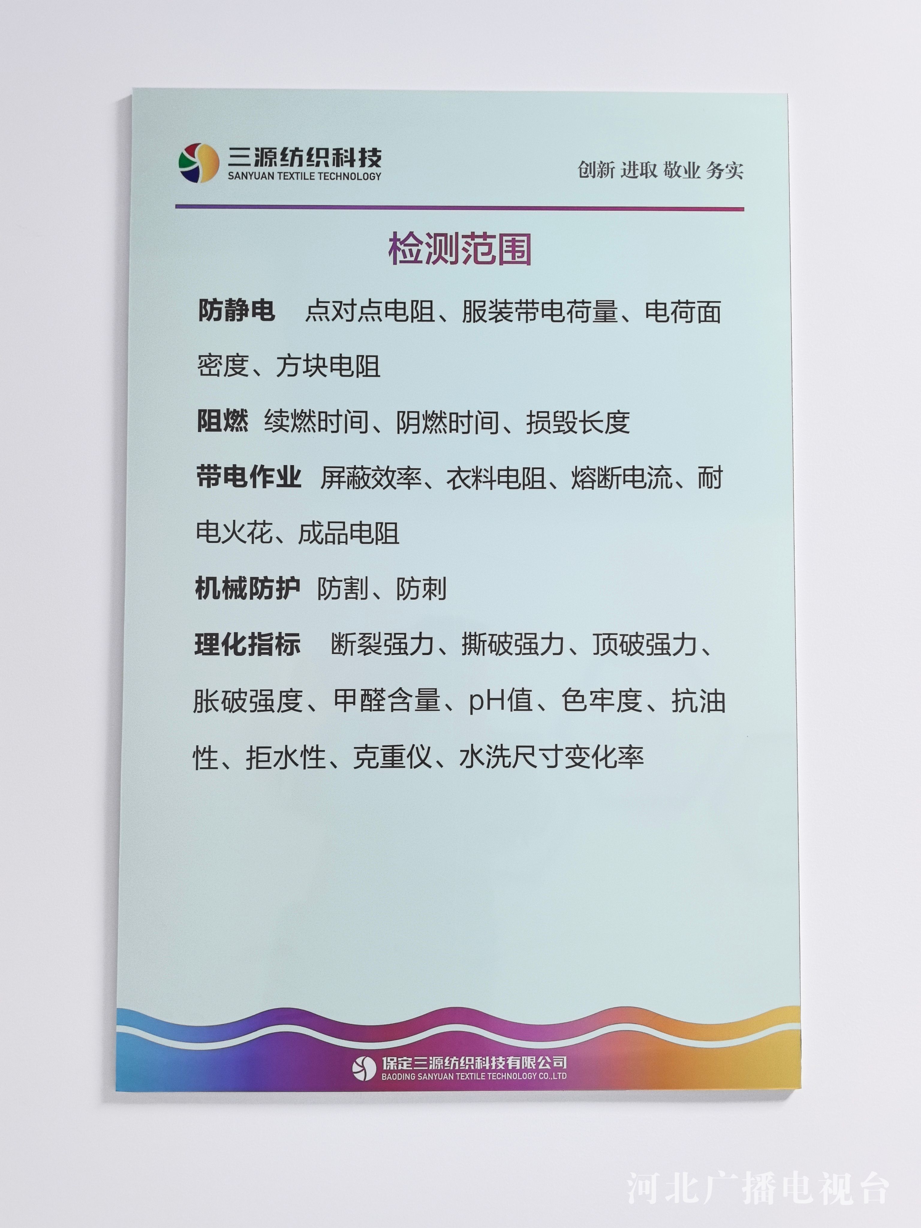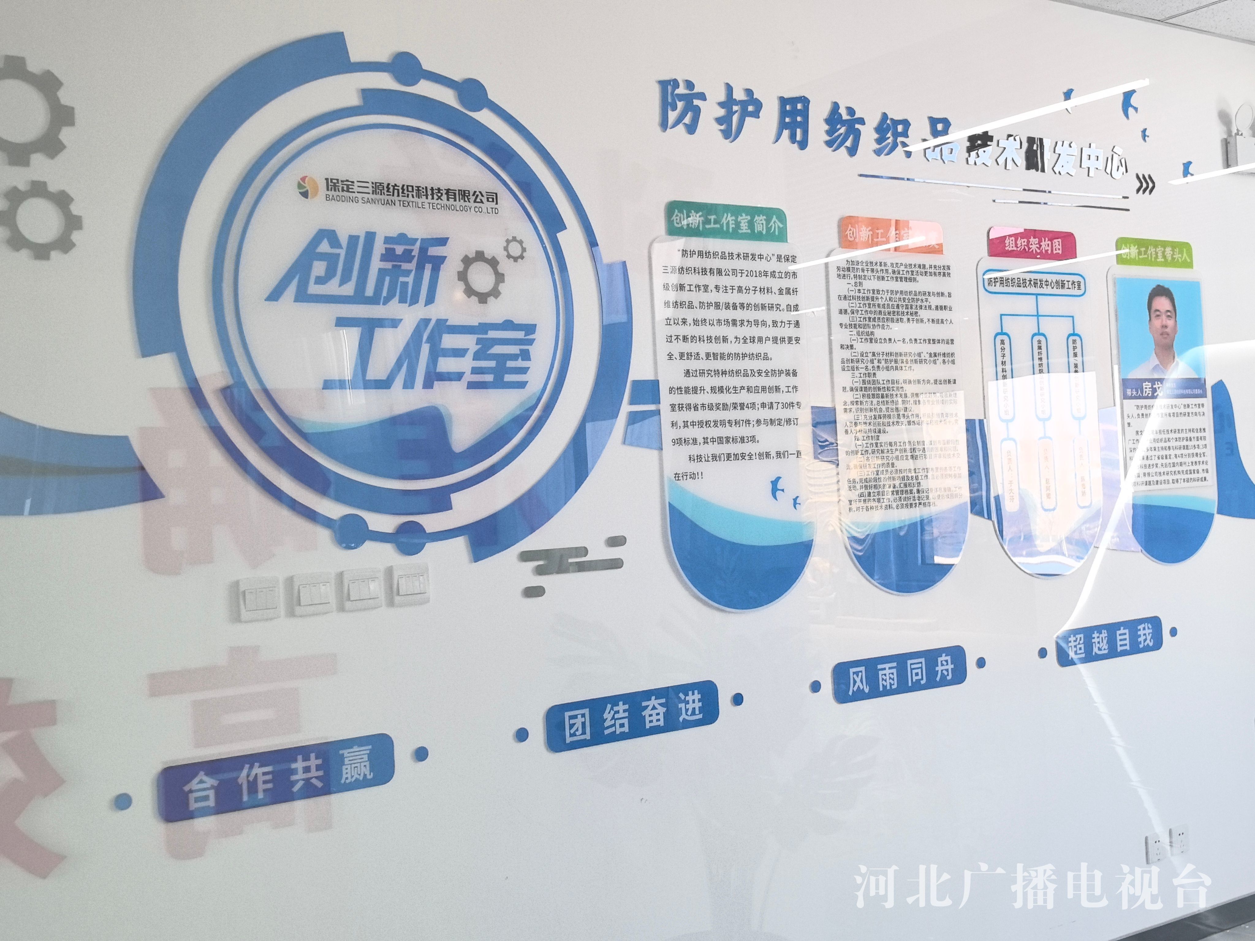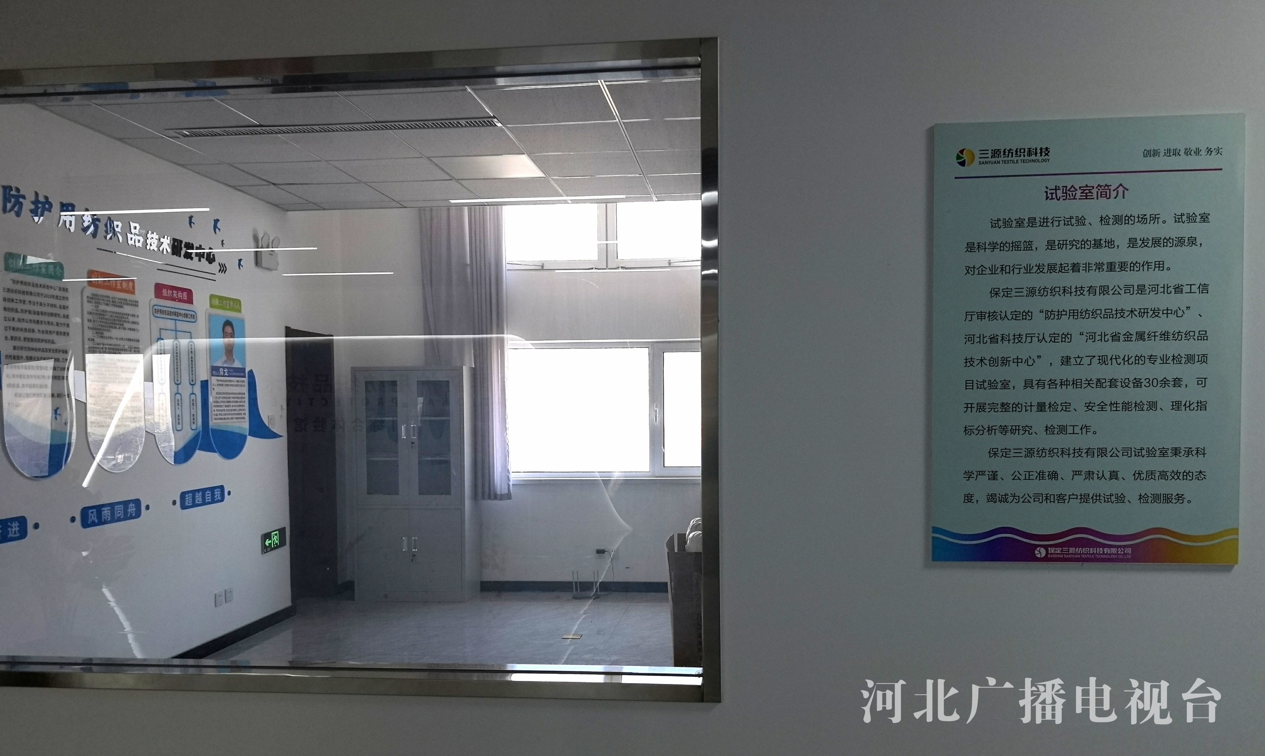 展厅旁边是三源纺织科技公司的试验室,也是防护用纺织品技术研发中心。作为中国纺织工程学会会员,三源纺织自主研发出150多项高新技术纺织品,主导产品有金属系列纺织制品、高分子纤维材料纺织制品、个体防护服装(面料)等。公司拥有棉纺、毛纺、金属纺三条生产线,具备机织、针织、编织、服装设计、制衣一条龙生产与加工能力。