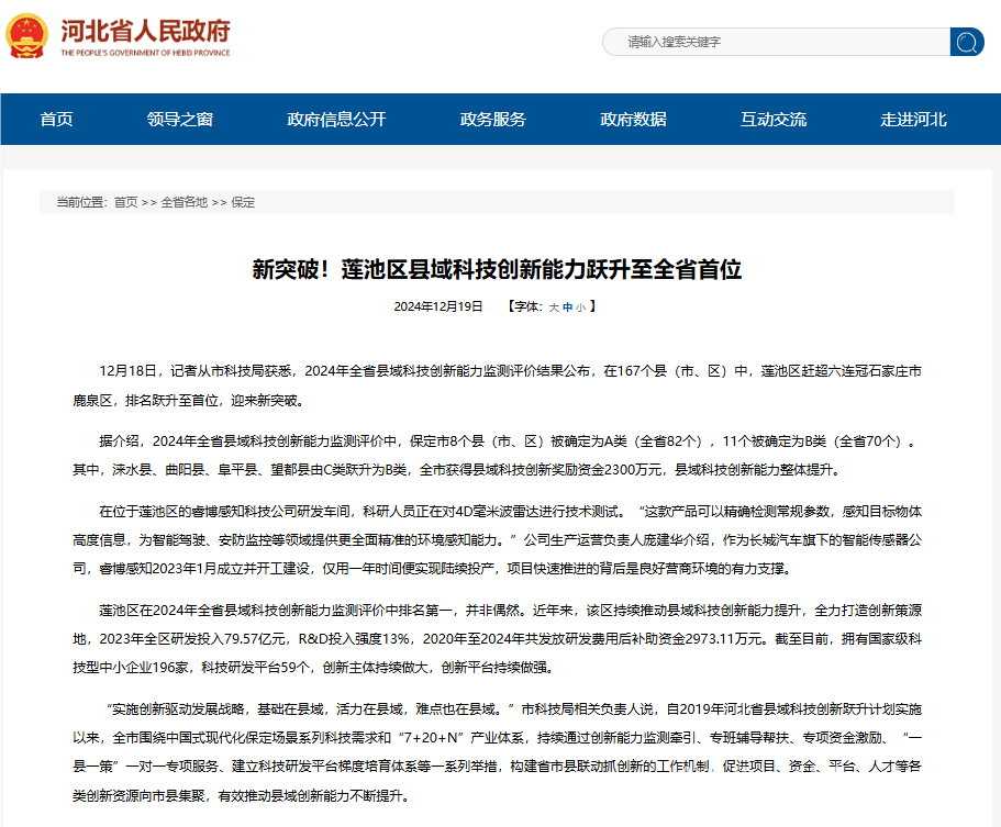 冀时客户端报道(河北台 王谦 )全媒系列报道《崛起中的新质生产力》,今天让我们跟随《新春走基层》记者王谦走进保定市莲池区,他们日前收获了一项新荣誉:2024年全省县域科技创新能力监测评价结果显示,在167个县(市、区)中,保定市莲池区赶超六连冠石家庄市鹿泉区,排名跃升至首位。