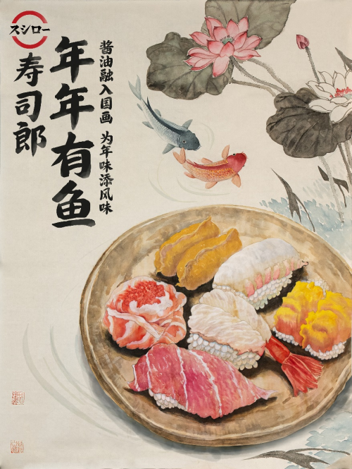 截至目前,寿司郎已连续两年联动中国文化。2024年春节,寿司郎携手剪纸非遗传人邓春红共创海苔剪纸码,创新形式令人眼前一亮,该项目获得ECI AWARDS营销创新类的金奖;2025年春节,寿司郎又选择了与国画艺术家尹德权合作,将寿司郎的酱油与国画艺术相结合,创作出一幅别具一格的作品——“年年有鱼”国潮绘。