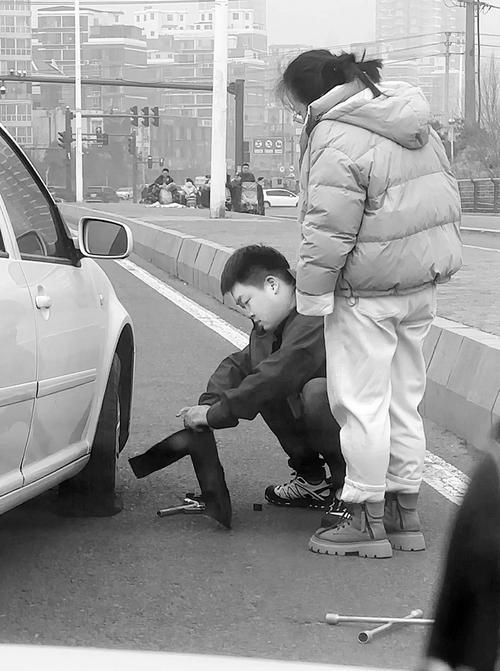 姚梓轩在帮助女车主换备胎。 (受访者供图)