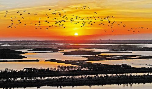 2024年10月20日清晨,沧州南大港湿地和鸟类自然保护区群鸟翱翔,景色迷人。