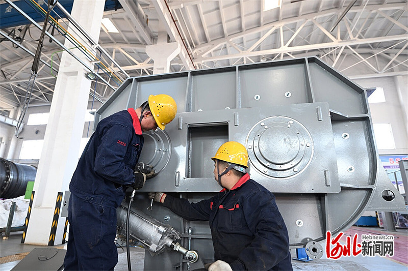 2月26日,廊坊德基机械科技有限公司,工人在安装全新模块多变型DGX沥青混合料搅拌设备部件,该设备可将混合料中的再生沥青料比例从30%多提升到80%。河北日报记者 赵永辉摄