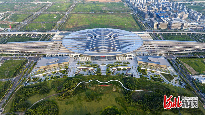 2024年7月26日拍摄的雄安站。据测算,雄安站站房屋顶分布式光伏发电项目年节约标准煤1800吨,减排二氧化碳4500吨。2022年8月,雄安站分布式光伏降碳产品实现生态价值转化16.6万余元。(河北日报资料片)河北日报记者田明摄