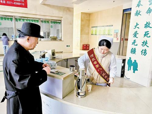 3月18日,河北省第八人民医院(河北省老年病医院)门诊大厅,导诊人员为患者倒热水。闫志学摄