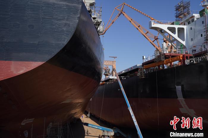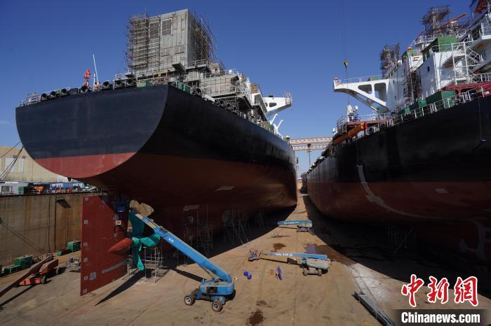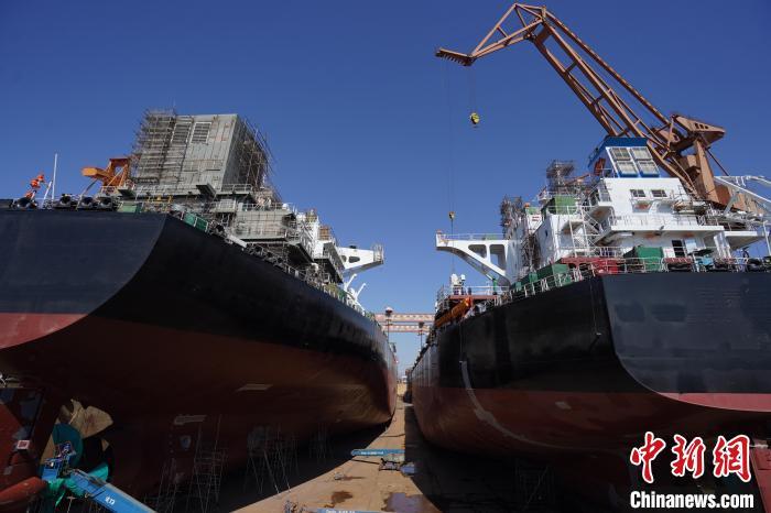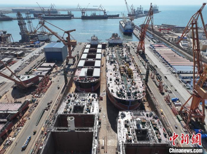 3月21日,在河北省秦皇岛经济技术开发区东区的船坞内,为海外建造的14艘11.5万吨成品油船正在加紧生产,这也是河北省目前建造的最大吨位的成品油船。据了解,该成品油船的建造要经过图纸设计、钢料加工、分段制作、坞内合拢、舾装涂装、下水试航等十几道工序,船型总长249.8米,型宽44米,型深21.2米,设计吃水13.75米,其操控性能、经济性能等均优于同类型船舶,具有较强的市场竞争力及良好的适港性和适航性。图为船坞内一片繁忙景象。(无人机照片)王继军 摄