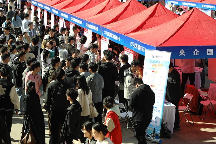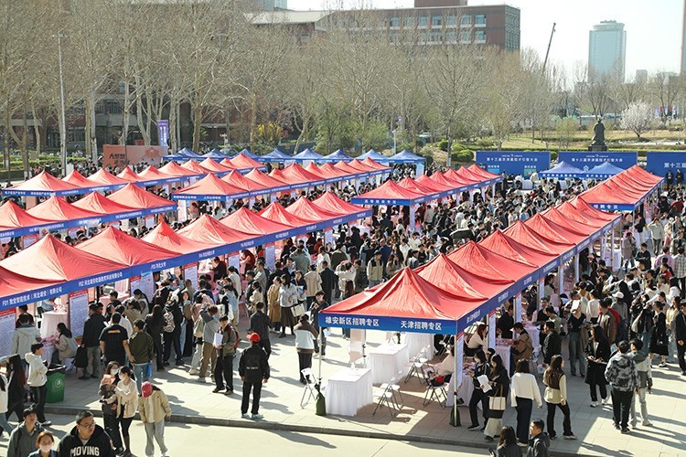 3月22日,京津冀人社部门在保定市河北大学共同举办了第十三届“京津冀招才引智大会”,图为活动现场。河北省人社厅供图